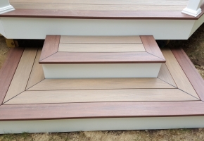 PVC Deck with Angled box treads Helical Footings and Pressure Treated framing with the two-tone decking of Wolf – Amberwood Field with Rosewood border. RDI- Titan Rails and wide, inviting box treads make this deck one of a kind.